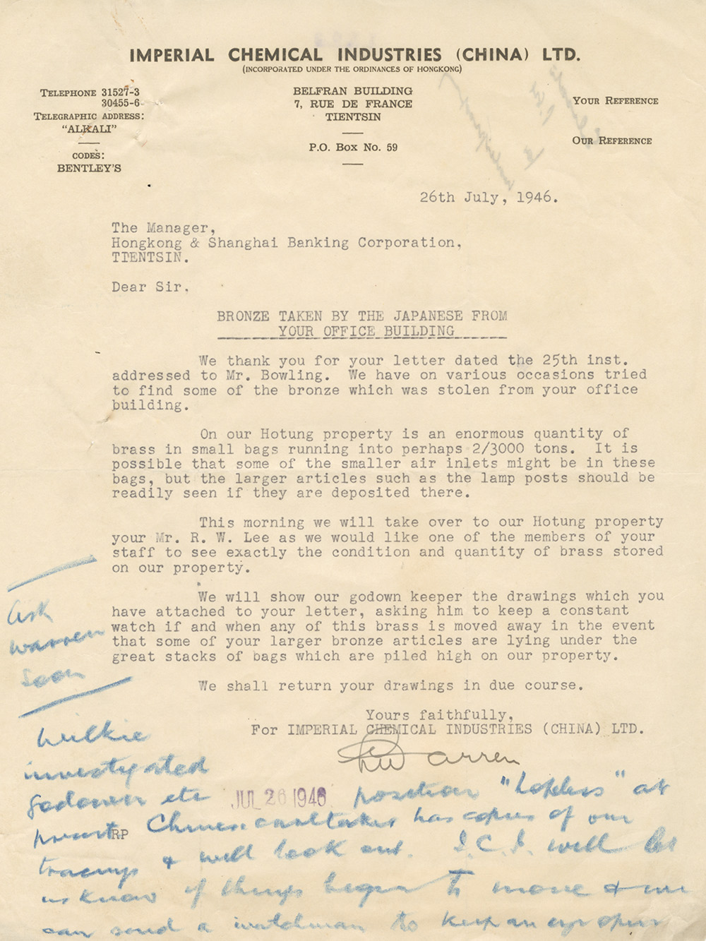 As freed internees began returning home, there were also plenty of departures in the opposite direction. Morse needed men on the ground as quickly as possible to start reconstructing business. He cleverly suggested some staff sign up for the UK government’s postwar civilian committees. This enabled them to secure tickets for the limited transport routes available. Thomas Fenwick – who had been involved in a dramatic escape from Hong Kong in 1942 – is one example. He arrived back in the city as early as 9 September 1945.