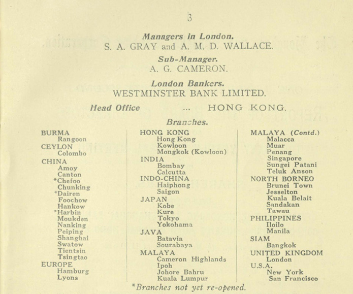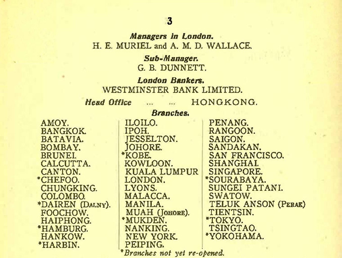 Vous serez intéressés de savoir que nous comptons actuellement trente-neuf bureaux, dont des agences, en activité. Sept succursales opérant avant-guerre sont encore fermées. Je tiens particulièrement à attirer l’attention sur le fait que nous avons reçu l’approbation du gouvernement chinois pour l’ouverture d’une nouvelle succursale à Nankin.