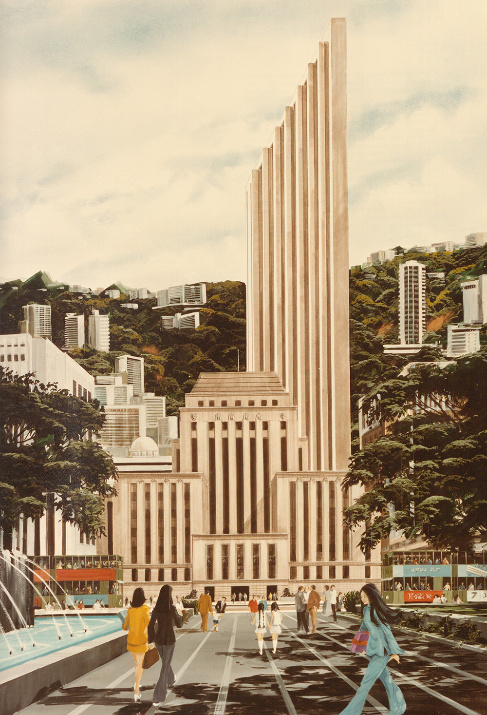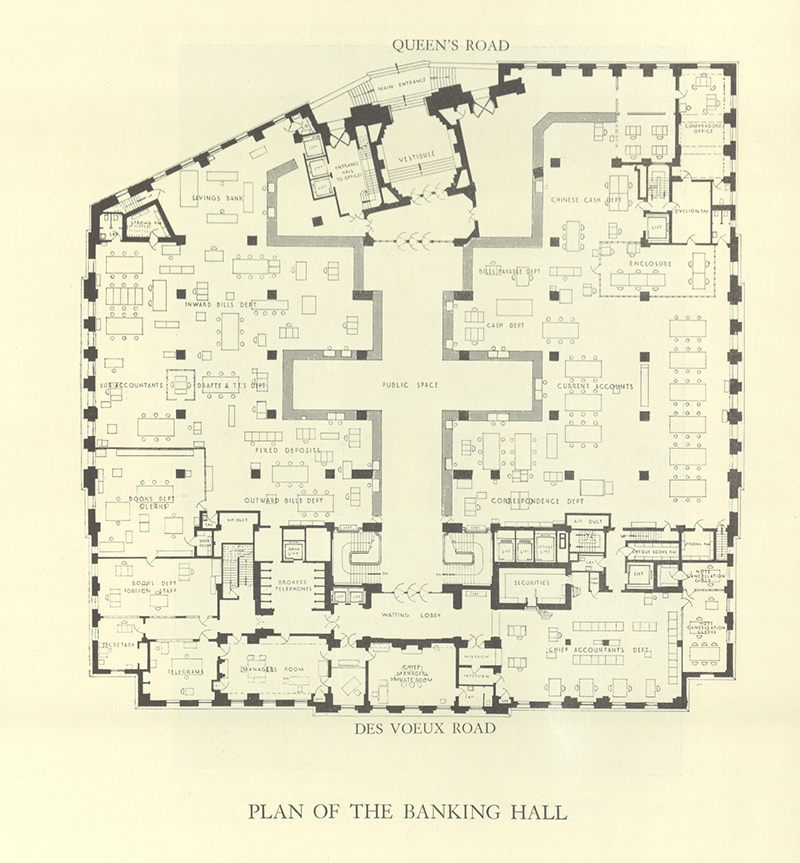 The challenge facing architects Palmer and Turner was fascinating. Chief Manager Vandeleur Grayburn specified that the design must highlight the 1 Queens Road Central entrance. However, the architects also knew the first impression for so many visitors would be from the harbour side on Des Voeux Road. Two grand entrances were required. Palmer and Turner also had to consider the curve of Queen’s Road.